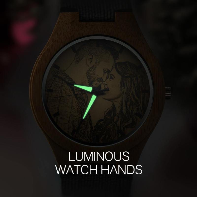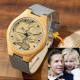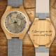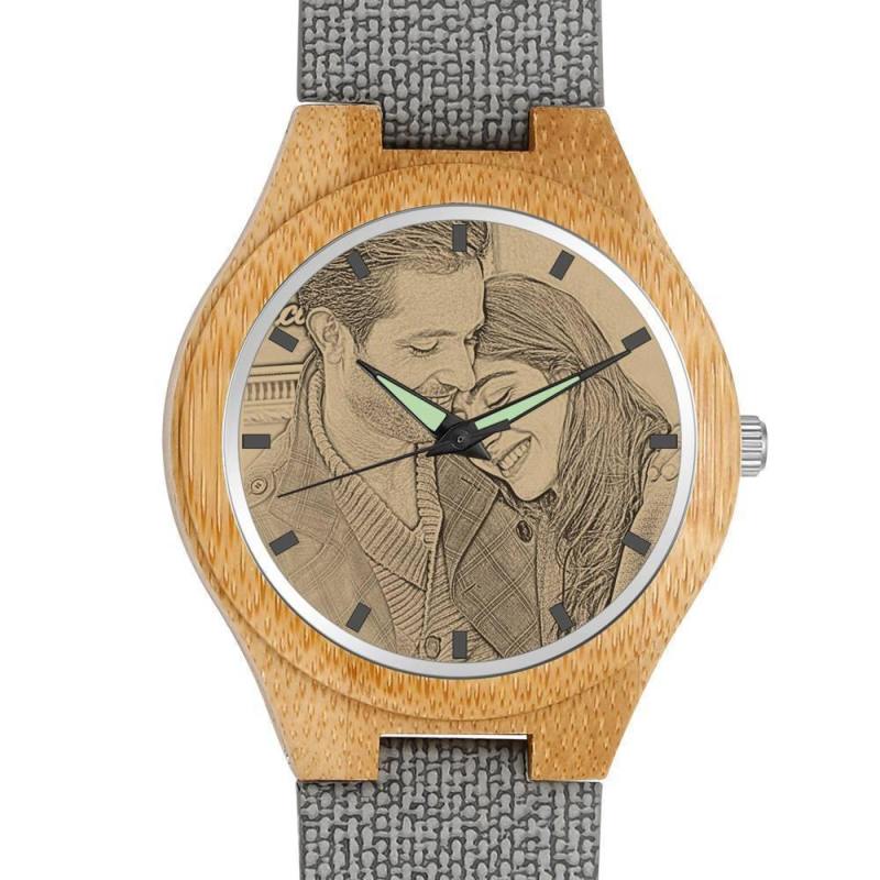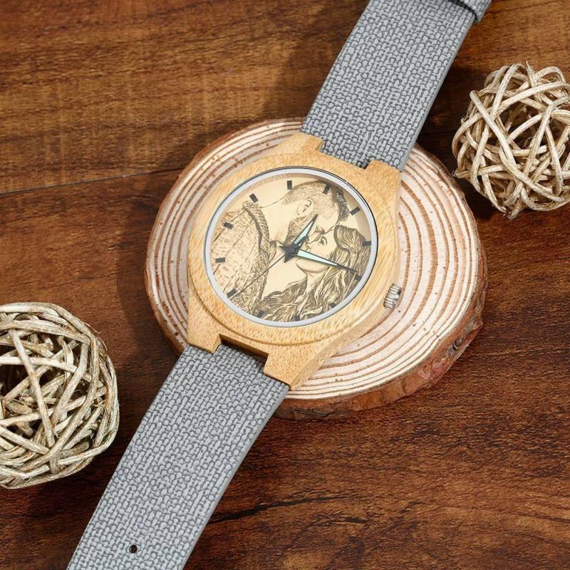 Herrenuhr Mit Fotogravur Aus Bambus, Graues Lederarmband, 45 Mm