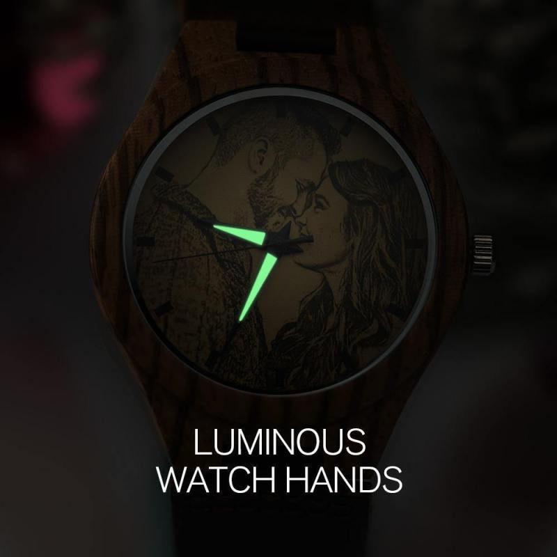 Herrenuhr Aus Holz Mit Fotogravur, Braunes Lederarmband, 45 Mm