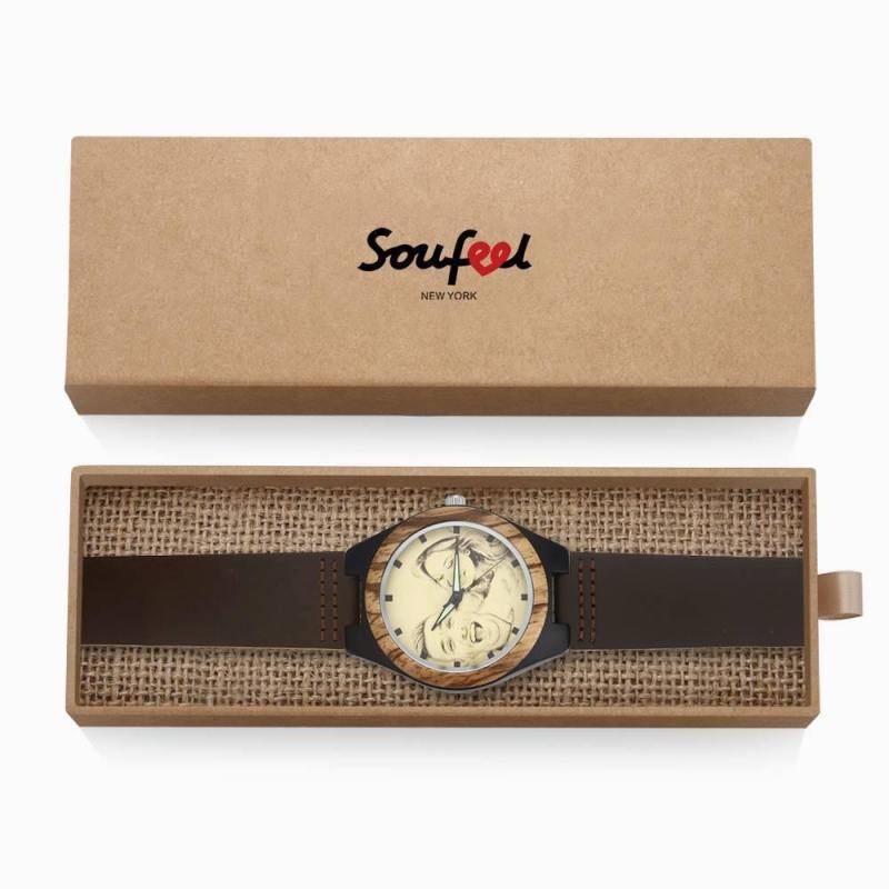 Herrenuhr Aus Holz Mit Fotogravur, Braunes Lederarmband, 45 Mm