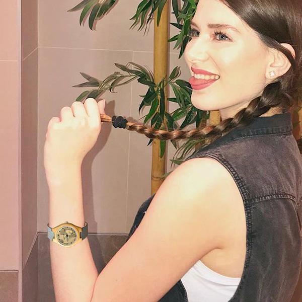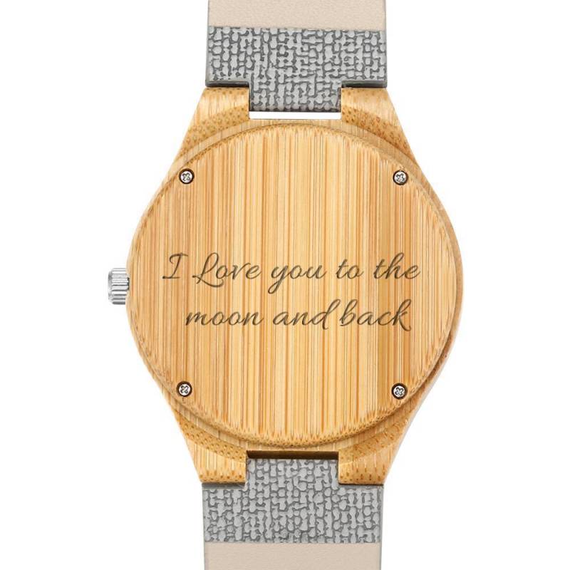 Damenuhr Mit Fotogravur Aus Bambus, Graues Lederarmband, 40 Mm